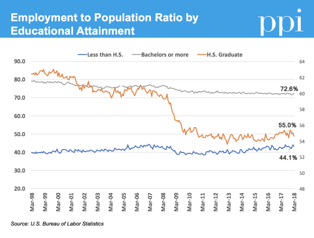 As the following chart shows, just 44.1 percent of Americans without a high school diploma and 55.0 percent of high school graduates work, versus close to three-quarters of workers with a bachelor’s degree or better.