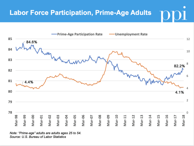 Workers with the least skills are also failing to prosper in comparison to their better-educated counterparts. In March 2018, the unemployment rate among workers with a bachelor degree was just 2.2 percent, or about half the rate for workers with a high school diploma or less than a high school education. These figures, however, don’t fully convey the disparities in employment between the best- and least-educated workers.